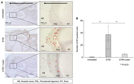 Almost no SP expression was observed on the compressed side of the periodontal ligament in rats in the untreated group (Figure 3A). The ETM group demonstrated increased expression of SP in the periodontal ligament compared to the untreated group (Figure 3A). Moreover, ETM-enhanced SP expression was suppressed by diode laser irradiation (Figure 3A). The SP-positive cells observed through immunohistochemical (IHC) staining are shown in Figure 3A, and the number of SP-positive cells in each group is shown in Figure 3B. The expression level of SP in the periodontal ligament increased significantly (37.4 ± 15.9, p < 0.01) in the ETM group compared to the untreated group (0.8 ± 0.7). Rats in the ETM + laser group exhibited significantly fewer SP-positive cells than those in the ETM group (5.3 ± 1.6 vs. 37.4 ± 15.9 cells, p < 0.01). Although no significant difference was observed in the number of SP-positive cells between the untreated and ETM + laser groups, the ETM + laser group had a higher number of SP-positive cells than the untreated group (5.3 ± 1.6 vs. 0.8 ± 0.7 cells, p = 0.725).
