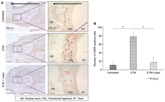 Immunohistochemical staining. CGRP expression in the periodontal tissues. (A) As tooth movement occurs in the direction of the arrow (black) in the figure, the left side of each root was considered the compression side. The arrowheads indicate CGRP-positive cells (red). (B) The number of CGRP-positive cells in the periodontal ligament on the compression side in the untreated, ETM, and ETM + laser groups. n = 5. ** p < 0.01 (Tukey’s tests). Scale bar, 500 μm in the left-hand slides (×4); 100 μm in the right-hand slides (×20). CGRP, calcitonin gene-related peptide; AB, alveolar bone; PDL, periodontal ligament; RT, root.