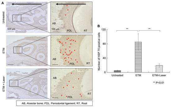 HSP 70 immunohistochemical staining. The expression of HSP 70 in the periodontal tissues. (A) As tooth movement occurs in the direction of the arrow (black) in the figure, the left side of each root was considered the compression side. Arrowheads indicate HSP 70-positive cells (red). (B) Number of HSP 70-positive cells in the periodontal ligament on the compression side in the untreated, ETM, and ETM + laser groups. n = 5. ** p < 0.01 (Tukey’s tests). Scale bar, 500 μm in the left-hand slides (×4); 100 μm in the right-hand slides (×20). HSP 70, heat shock protein 70; AB, alveolar bone; PDL, periodontal ligament; RT, root.