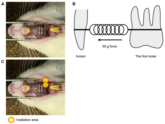 Experimental tooth model. (A) A 50-gF nickel–titanium (Ni-Ti) closed-coil spring was applied between the upper left first molar and upper incisors of the rat using an orthodontic ligature wire. (B) The buccal and palatal sides of the first molar were irradiated for 45 s in each area, and the total energy was set to 100.8 J/cm2. (C) In vivo model of experimental tooth movement. A Ni-Ti closed-coil spring was used, and the orthodontic force was set to 50 g. The ligatures were bonded with resin cement to prevent detachment of the appliance.