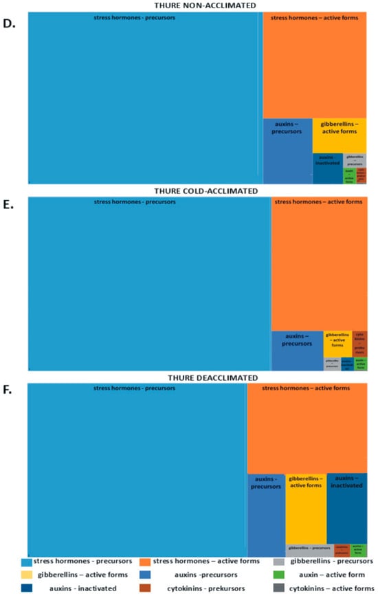 The hierarchical tree diagram shows the percentage content of groups of phytohormones: auxins, cytokinins, gibberellins, and so-called stress hormones (abscisic, jasmonic, and salicylic acids) in the total pool (Figure 1). In both tested cultivars, stress hormone precursors represented the highest amount of all hormones. Non-acclimated and deacclimated plants, in comparison to cold-acclimated ones, are characterized by greater amounts of growth-promoting hormones (e.g., active forms of gibberellins and their precursors). Cold-acclimated plants exhibit a greater accumulation of active forms of stress hormones (Figure 1A–F).