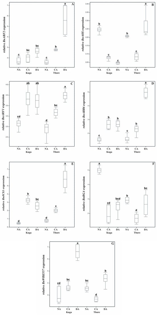 Accumulation of the hormone-related transcript genes—BnABF2 (A), BnAOS (B), BnARF1 (C), BnARR6 (D), BnICS1 (E), BnRGA (F), and BnWRKY57 (G) in the leaves of the non-acclimated (NA), cold-acclimated (CA), and deacclimated (DA) oilseed rape cv. Kuga and cv. Thure. The results of the accumulation of the transcripts are presented as the fold change in the expression of the BnABF2, BnAOS, BnARF1, BnARR6, BnICS1, BnRGA, and BnWRKY57 genes in the given samples compared to the endogenous reference gene actin. Values marked with the same letters were not significantly different according to the Duncan test (p ≤ 0.05).