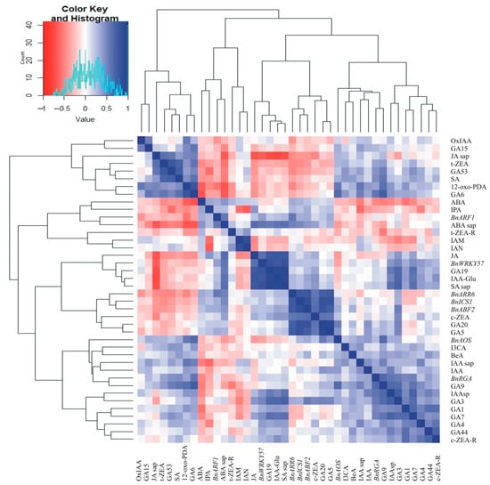 A very large number of significant correlation coefficients were observed between hormone contents in cell sap and gene expressions (Figure 4). Statistically significant correlations (at the level of 0.001) were noted for 79 pairs (Figure 4). A positive correlation was observed for 66 pairs: 12-oxo-PDA–GA9, 12-oxo-PDA–GA6, 12-oxo-PDA–IAA sap, JA–GA19, JA–IAA-Glu, JA–ABA sap, JA–SA sap, JA–BnWRKY57, SA–GA9, SA–GA53, SA–GA6, SA–t-ZEA, GA15–GA6, GA9–GA7, GA9–GA3, GA9–GA6, GA9–IAAsp, GA9–BnAOS, GA9–BnRGA, GA53–GA1, GA53–t-ZEA, GA53–JA sap, GA44–c-ZEA-R, GA19–GA7, GA19–GA3, GA19–IAA-Glu, GA19–SA sap, GA19–BnWRKY57, GA20–GA5, GA20–c-ZEA, GA20–BnICS1, GA20–BnABF2, GA20–BnARR6, GA4–c-ZEA-R, GA7–GA3, GA7–GA1, GA7–IAAsp, GA7–IAA-Glu, GA7–SA sap, GA3–IAAsp, GA3–IAA-Glu, GA3–SA sap, GA6–t-ZEA, GA6–BnAOS, GA6–BnRGA, GA1–c-ZEA-R, GA5–c-ZEA, GA5–BnICS1, GA5–BnABF2, GA5–BnARR6, IAM–IAN, IAAsp–SA sap, IAAsp–BnRGA, IAA-Glu–ABA sap, IAA-Glu–SA sap, IAA-Glu–BnWRKY57, t-ZEA–JA sap, c-ZEA–BnICS1, c-ZEA–BnABF2, c-ZEA–BnARR6, ABA sap–SA sap, ABA sap–BnWRKY57, SA sap–BnWRKY57, BnICS1–BnABF2, BnICS1–BnARR6, and BnABF2–BnARR6 (Figure 4). However, a strong negative correlation was observed for 13 pairs of traits: 12-oxo-PDA–ABA, 12-oxo-PDA–ABA sap, ABA–GA6, JA–JA sap, GA53–IPA, GA19–JA sap, GA6–ABA sap, IAM–IPA, IAN–IPA, IAA-Glu–JA sap, IPA–IAA sap, ABA sap–JA sap, and SA sap–JA sap (Figure 4).