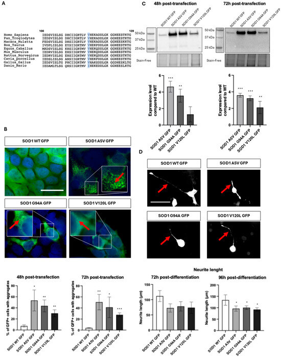 (A) Conservation of the Val120 position in SOD1 among animal species using SeaView. (B) Immunostaining of HEK293T cells using the GFP antibody (#632592, Takara, Otsu, Japan) 72 h after transfection with various plasmids (Lipofectamine 2000, Thermo Fisher Scientific, Waltham, MA, USA), and percentage of cells showing aggregates 48 or 72 h post-transfection. Plasmids expressed GFP-linked wild-type SOD1 protein (SOD1 WT GFP), the positive controls SOD1 p.Ala5Val (SOD1 A5V GFP), or SOD1 p.Gly94Ala (SOD1 G94V GFP) often used in ALS studies, or the variant of interest SOD1 p.Val120Leu (SOD1 V120L GFP). Red arrows in the enlargements indicate the presence of GFP-positive aggregates. (C) Western blot analysis of the insoluble protein fraction in HEK293T cells at 48 and 72 h post-transfection using anti-GFP antibody (log2 fold changes; upper part) (stain-free gel for normalization; bottom part). (D) Quantification of neurite length on NSC34 cells 72 h (red arrows on photographs) and 96 h post-differentiation using ImageJ software v2.14.0. t-test and Kruskal–Wallis test (* p < 0.05; ** p < 0.01; *** p < 0.001) (scale bars: 75 μm).
