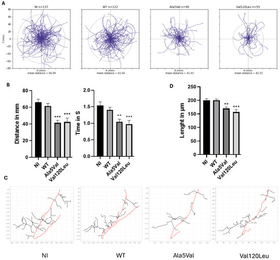 We next used the zebrafish model, an in vivo model often used in ALS studies [10]. Zebrafishes expressing the SOD1 p.Val120Leu variant showed behavioral swimming deficits (reduced swimming distance and time) and decreased axonal length similar to zebrafish expressing the pathogenic mutant SOD1 p.Ala5Val (p < 0.01), a well-characterized positive control in ALS (Figure 2A–C).