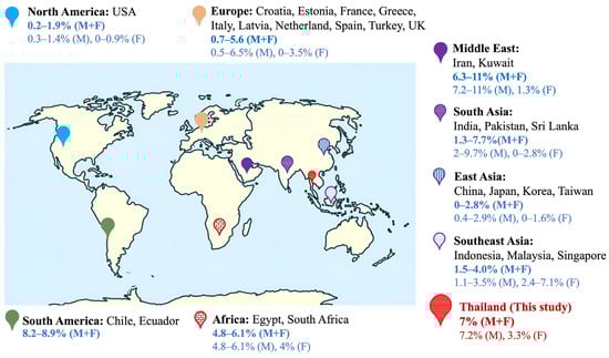 | Males with ID | Child psychiatric clinic/Northern Thailand | 2007–2008 | Present study | Male: 101 | Male: 8 (7.9%) | Male: 0 | Male: 93 (92.1%) |