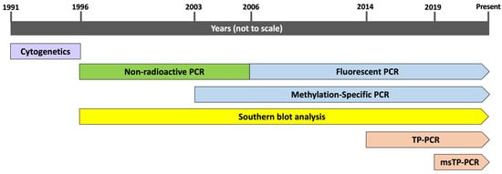 - Rajan-Babu, I.-S.; Teo, C.R.L.; Lian, M.; Lee, C.G.; Law, H.-Y.; Chong, S.S. Single-Tube Methylation-Specific Duplex-PCR Assay for Rapid and Accurate Diagnosis of Fragile X Mental Retardation 1-Related Disorders. Expert Rev. Mol. Diagn. 2015, 15, 431–441. [Google Scholar] [CrossRef]