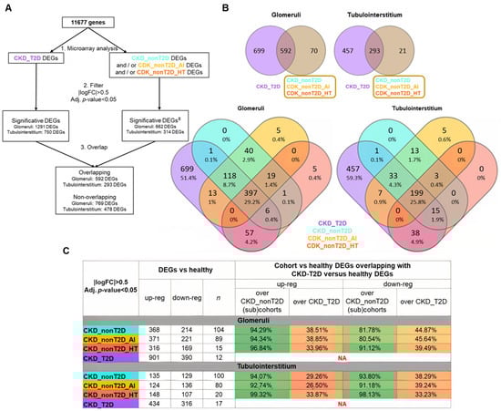 DEGs from comparing cohorts/subcohorts against healthy control samples. (A) Description of the path followed during the analysis. (±) Significative DEGs must satisfy the filter for, at least, CKD_nonT2D or one of its subcohorts, but not for all of them. Overlapping DEGs are defined as those that show an overlap between CKD_T2D and CKD_nonT2D or any of its subcohorts. (B) Venn diagrams. CKD_nonT2D and CKD-T2D overlap for glomeruli and tubulointerstitium. (lower panels) CKD_nonT2D, CKD-T2D, CKD_nonT2D_AI, and CKD_nonT2D_HT overlap for glomeruli and tubulointerstitium. (C) Summary of the differential expression analysis in glomeruli and tubulointerstitium and the proportion of DEGs in common between diabetic and non-diabetic cohorts compared to healthy, n = number of samples. DEGs: differentially expressed genes; AI: Autoimmune; CKD_T2D: chronic kidney disease cohort associated with type 2 diabetes mellitus; CKD_nonT2D: chronic kidney disease cohort not associated with type 2 diabetes; HT: hypertensive. To aid interpretation, different colors were used to distinguish study cohorts: ice blue for CKD_nonT2D, mauve for CKD_nonT2D, topaz for CKD_nonT2D, and tangerine for CKD_nonT2D.