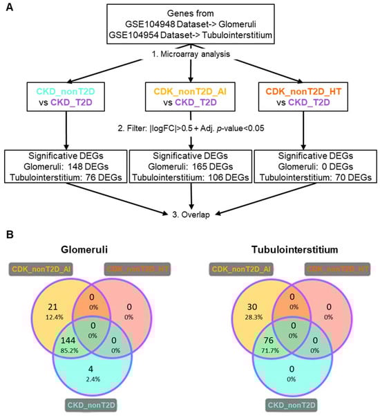 DEGs from direct comparison between the CKD_T2D vs. CKD_nonT2D cohort/subcohorts. (A) Description of the path followed during the analysis. Overlapping DEGs are defined as those that show an overlap between CKD_T2D and CKD_nonT2D or any of its subcohorts. (B) Venn diagrams for the results of glomeruli and tubulointerstitium direct comparison with CKD_T2D (represented by purple edges). DEGs: Differentially expressed genes; CKD_T2D: chronic kidney disease cohort associated with type 2 diabetes mellitus; CKD-nonT2D: chronic kidney disease cohort not associated with type 2 diabetes; CKD_nonT2D_AI: autoimmune chronic kidney disease; CKD_nonT2D_HT: hypertension CKD. To aid interpretation, different colors were used to distinguish study cohorts: ice blue for CKD_nonT2D, mauve for CKD_nonT2D, topaz for CKD_nonT2D, and tangerine for CKD_nonT2D.