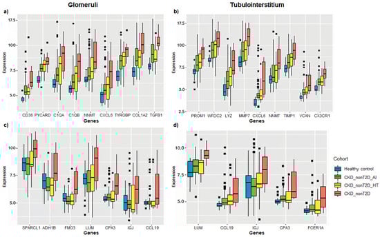 Box plots showing the expression of selected DEGs across CKD subtypes relative to healthy controls. Genes were selected for their consistent behavior in both renal compartments (glomeruli and tubulointerstitium) and for presenting some of the highest log fold change (logFC) values across comparisons. Panels (a,b) display overlapping direct genes, while panels (c,d) present non-overlapping direct and inverse genes. Expression is represented as logFC values for each comparison between CKD subgroups (CKD_T2D, CKD_nonT2D_AI, CKD_nonT2D_HT) and controls. Panels a and c correspond to glomerular data, and panels b and d to tubulointerstitial data. Data were obtained from chip definition files of GSE104948 (glomeruli) and GSE104954 (tubulointerstitium).