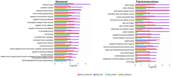 Focusing on processes enriched in diabetic CKD and also in hypertension-CKD (Figure 8), we found similar results as before, more immune-related in glomeruli, where terms such as chemokine activity, complement activation, lymphocyte-mediated immunity, and toll-like receptor signalling pathways are significantly enriched in CKD_T2D, indicating heightened innate and adaptive immune responses in the glomerular compartment of diabetic patients. In contrast, the tubulointerstitial compartment showed a stronger enrichment of metabolic and transport-related pathways. In particular, CKD_T2D exhibited activation of pathways involved in vitamin metabolism (e.g., vitamin B6 binding, pyridoxal phosphate binding), fatty acid oxidation, and mitochondrial/peroxisomal function (e.g., aerobic respiration, protein targeting/localization to peroxisomes, peroxisomal transport). Beyond general metabolic categories, some of these processes converge on well-defined regulatory axes such as PPAR signaling, which orchestrates lipid metabolism and mitochondrial β-oxidation, and mTOR signaling, a central pathway in nutrient sensing, cellular growth, and metabolic homeostasis. The enrichment of these pathways in CKD_T2D suggests a more profound metabolic remodeling in the tubulointerstitium under diabetic conditions, integrating both basal bioenergetic processes and higher-order regulatory responses, potentially contributing to disease-specific progression in a compartment-specific manner.