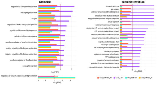 Significantly enriched processes in CKD_T2D but not in CKD_nonT2D. The figure illustrates the results of gene set enrichment analysis (GSEA), depicting significantly enriched biological processes in glomerular and tubulointerstitial compartments across four CKD subtypes: hypertensive CKD (CKD_nonT2D_HT), diabetic CKD (CKD_T2D), overall non-diabetic CKD (CKD_nonT2D), and autoimmune CKD (CKD_nonT2D_AI). Bars represent enrichment significance as –log(FDR), with higher values indicating greater statistical significance. The red line shows the proportion of null hypotheses in the data.