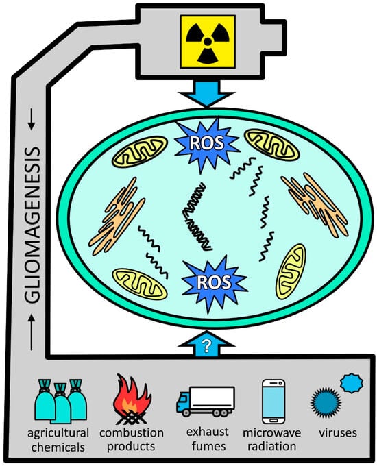 Glial tumor-promoting stressors. Ionizing radiation is among the well-documented factors leading to glioma formation and is associated with oxidative stress. With less proven effects, other factors include pesticides, burn pit-derived combustion products, and vehicle exhaust fumes. Although still somewhat speculatory, viruses are widely recognized as contributing to gliomagenesis. Abbreviations: ROS, reactive oxygen species.