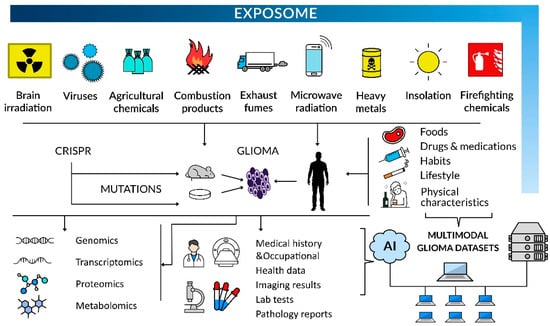 These combined bioinformatics and molecular biology approaches will reinforce the epidemiological data analyses to identify modifiable risk factors of glioma inception and tumor development associated with occupational or environmental exposure. The concept of the exposome as a totality of exposures that an individual encounters throughout life can be applied to personalize treatment options and prognosis (Figure 2). No less important is the population-centered exposomics based on community-level monitoring of environmental exposures, including pollutants, internal markers of exposure, and population health status []. Progress in this respect comprises developing new protocols/procedures to investigate the exposome, e.g., organic pollutants in normal and tumoral brain tissues and establishing new networks of sensors for multiple exposures, in order to create, among others, exposomic maps [,]. It also involves elaborating exposome atlases and other exposomic databases to provide a framework for exposome assessment [].