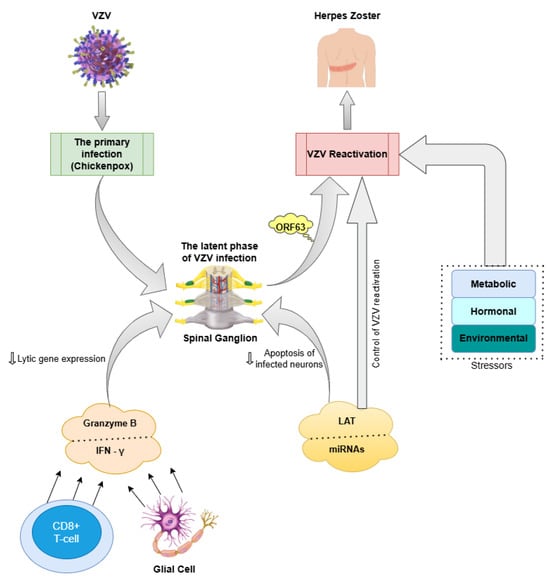 VZV is the third human alpha-herpesvirus, as well as the pathogen that causes chickenpox upon first exposure and shingles (herpes zoster) when reactivated [,]. After the initial illness subsides, VZV remains dormant within the spinal ganglia []. Once the virus enters a latent state, keeping it suppressed requires constant involvement from surrounding virus-specific CD8+ T cells and glial cells, which inhibit lytic gene expression by releasing granzyme B and IFN-γ. A latency-associated transcript (LAT) is also expressed, along with several microRNAs (miRNAs), which are key features of alpha-herpesvirus latency. Even though the exact function of LAT transcripts remains unclear, research suggests that such non-coding RNAs play a role in preventing programmed cell death within neurons harbouring the infection and regulating the virus’s ability to reactivate []. In terms of reactivation, it can be triggered by various stressors, such as metabolic, hormonal, and environmental changes []. Interestingly, VZV produces six various transcripts and proteins during latency. Among them, open reading frame 63 (ORF63) is one of the most plentiful proteins, remaining mostly in the cytoplasm during latency but shifting predominantly to the nucleus during lytic infection [].