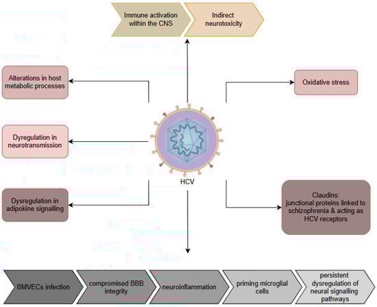Among infectious agents, neurotropic viruses, particularly herpesviruses such as herpes simplex viruses (HSVs), cytomegalovirus (CMV), and human herpesvirus 6 (HHV-6), have emerged as prime candidates in the pathogenesis of schizophrenia. These viruses employ sophisticated strategies to establish persistent central nervous system infections, with herpesviruses detected in 22–43% of healthy brain tissue samples []. Their potential pathogenic mechanisms are diverse, ranging from direct neuronal invasion and persistence in limbic structures to molecular mimicry that triggers autoimmunity [,,]. Furthermore, the resulting pro-inflammatory cytokine discharge, including interleukin-1β (IL-1β), IL-6, and TNF-α [], and the disruption of the blood–brain barrier [,] can collectively lead to the neurodevelopmental abnormalities characteristic of schizophrenia.