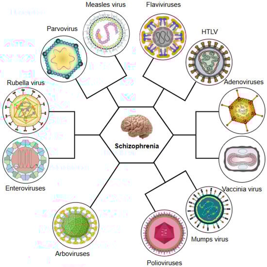 - Kotsiri, I.; Resta, P.; Spyrantis, A.; Panotopoulos, C.; Chaniotis, D.; Beloukas, A.; Magiorkinis, E. Viral Infections and Schizophrenia: A Comprehensive Review. Viruses 2023, 15, 1345. [Google Scholar] [CrossRef] [PubMed]