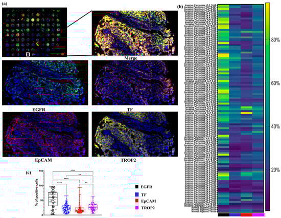 Expression profiles of EGFR, TF, EpCAM, and TROP2 in TNBC tissues. (a) Representative mIF images showing the expression of EGFR, TF, EpCAM, and TROP2 in TNBC issues (TMA BR1102). Images included full core scans of 110 samples and corresponding high-magnification (100×) views from selected regions, with each marker visualized in a distinct fluorescent channels. (b) Heatmap depicting the distribution and relative expression levels of EGFR, TF, EpCAM, and TROP2 across 110 different tissues cores, enabling comparative visualization of marker-positive cell proportion. (c) Boxplot illustrating the median, the interquartile range, and the individual percentage of cells positive for each marker across the 104 different TNBC tissues cores. **, p ≤ 0.01; ****, p ≤ 0.0001.