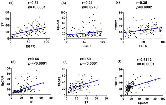 A strong positive correlation was observed between EGFR and TF expression (r > 0.51, p < 0.0001), suggesting potential biological interplay or co-regulation. Similarly, EGFR demonstrated a moderate positive correlation with TROP2 (r > 0.35, p < 0.0002). In contrast, EGFR and EpCAM showed only a weak correlation (r > 0.21, p < 0.0270). Notably, TF and EpCAM displayed a moderate correlation (r > 0.44, p < 0.0001), while TF and TROP2 exhibited a strong positive correlation (r > 0.51, p < 0.0001). Additionally, a significant positive correlation was also detected between EpCAM and TROP2 (>0.50, p < 0.0001), suggesting potential co-expression of epithelial and trophoblastic features in subsets of TNBC (Figure 2d–f).
