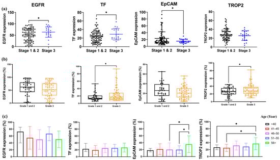 Differential expression of EGFR, TF, EpCAM, and TROP2 across TNBC stage, grade, and patient age. (a) Comparison of EGFR, TF, EpCAM, and TROP2 expression levels between early-stage (stage I–II) and advanced-stage (stage III) TNBC tissues. (b) Expression differences of the four markers between lower-grade tumors (grade 1−2) and high-grade tumors (grade 3). (c) Expression patterns of EGFR, TF, EpCAM, and TROP2 across five patient age groups. Boxplots display the distribution of marker-positive cell (%), and statistical significance was assessed using one-way ANOVA with post hoc Tukey’s test. Asterisks indicate levels of significance: *, p < 0.05.