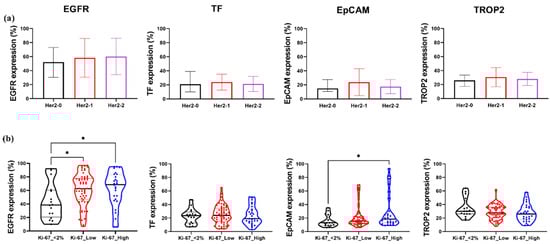 Expression patterns of EGFR, TF, EpCAM, and TROP2 in relation to HER2 and Ki-67 status in TNBC. (a) Comparison of EGFR, TF, EpCAM, and TROP2 expression levels across TNBC samples stratified by HER2 status: HER2-0, Her2-1+, and Her2-2+. (b) Expression analysis of the same four markers in TNBC samples grouped by Ki-67 proliferation index: Ki-67 < 2%, Ki-67 low (2–49%), and Ki-67 high (≥50%). Boxplots represent the distribution of marker-positive cells (%). Statistical significance was assessed using one-way ANOVA with Tukey’s post hoc test. *, p < 0.05.