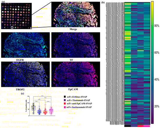 Binding specificity scFv-SNAP fusion proteins in TNBC tissue. (a) Microphotographs from mIF showing the binding specificities of four scFv-SNAP fusion proteins—scFv-Erbitux-SNAP, scFv-Tisotumab-SNAP, scFv-anti EpCAM-SNAP, and scFv-Sacituzumab-SNAP—across 110 tissue samples. Representative 100× images from a single core are shown for each fusion protein, with visualization across four fluorescence channels. (b) A heatmap depicting the percentage of cells bound by each scFv-SNAP fusion proteins in all 104TNBC tissues. (c) Boxplot illustrating the median, interquartile range, and individual percentage of cells binding for each scFv-SNAP fusion proteins across the tissue samples for each marker. ****, p ≤ 0.0001.
