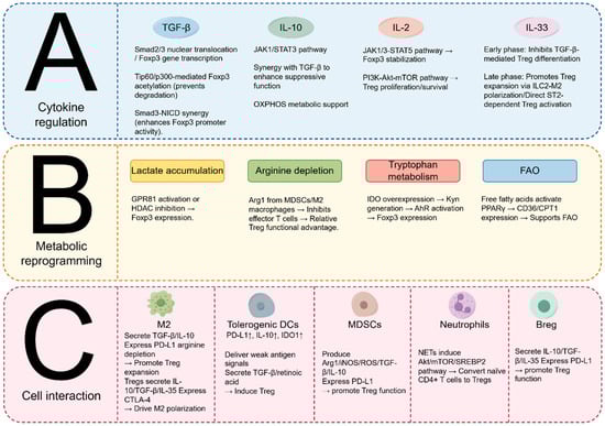 (A–C) The immunoregulatory network that governs Treg differentiation and maintenance in sepsis cytokine signaling pathways, including TGF-β/Smad3, IL-10/STAT3, IL-2/STAT5, and IL-33/ST2, critically drive Treg differentiation and functional stability. These cytokines originate from multiple sources and act in concert to modulate Foxp3 expression and Treg expansion. Interactions with immune cells such as tolerogenic dendritic cells (DCs), M2-polarized macrophages, myeloid-derived suppressor cells (MDSCs), and regulatory neutrophils shape Treg activity. DCs utilize PD-L1 and IDO to promote immune tolerance, macrophages secrete TGF-β and IL-10 while depleting arginine via Arg1, and MDSCs further contribute immunosuppressive cytokines and metabolic modulation to support Tregs. Metabolic reprogramming enables Tregs to sustain their suppressive function within the inflammatory milieu of sepsis. This includes utilization of lactate, enhanced oxidative phosphorylation (OXPHOS), arginine depletion, kynurenine signaling via the aryl hydrocarbon receptor (AhR), and fatty acid oxidation.