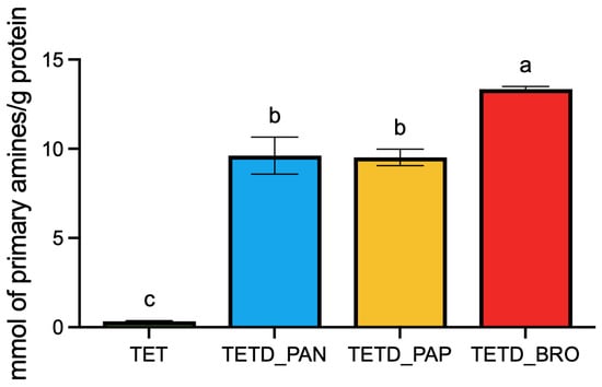 These results were confirmed by OPA quantification (Figure 2), which measures the release of primary amino groups during hydrolysis. The results show that the TETD_BRO sample presents the highest amount of α-amino nitrogen per g of extracted protein (13.35 ± 0.15), followed by TETD_PAP and TETD_PAN (respectively, 9.61 ± 1.04 and 9.51 ± 0.46; p-value = 0.9962).