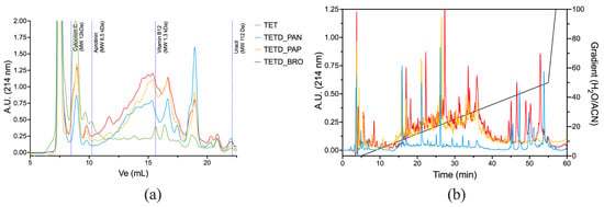 Chromatographic profiles of enzymatically digested protein extracts. Panel (a): SEC-HPLC elution profiles monitored at 214 nm with a flow of 0.5 mL/min. The dashed vertical lines indicate elution volumes of molecular weight standards. Panel (b): RP-HPLC chromatograms of the same samples, monitored at 214 nm, with the acetonitrile gradient (H2O/ACN, % v/v) shown by the black line. Samples: TET (green), TETD_PAN (blue), TETD_PAP (yellow), and TETD_BRO (red).