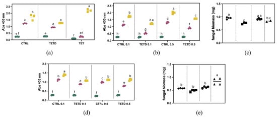 Antifungal activity evaluation of undigested and bromelain-derived hydrolysate at different concentrations against Fusarium graminearum (Panels (a,b)) and F. oxysporum f.sp. lycopersici (Panel (d)). Green = 1 day of growth; Red = 3 days of growth; Yellow = 5 days of growth. Panels (c,e): Dry weight after 5 days of growth of Fusarium graminearum colonies and F. oxysporum f.sp. lycopersici colonies, respectively. Diamond = Control 0.1 mg/mL, Squares = TETD 0.1 mg/mL, Circles = Control 0.5 mg/mL, Triangles = TETD 0.5 mg/mL. The data are expressed as mean ± standard deviation (n = 4). Statistical analysis was performed using one-way ANOVA followed by Tukey’s post hoc test. Different letters indicate statistically significant differences among groups (p < 0.05).
