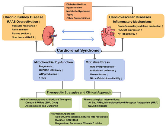 The intricate interplay between cardiovascular disease (CVD) and CKD is underpinned by shared pathophysiological mechanisms, including the sustained activation of the renin–angiotensin–aldosterone system (RAAS), systemic inflammation, oxidative stress, endothelial dysfunction, mitochondrial impairment, and progressive tissue fibrosis [4,5,6].