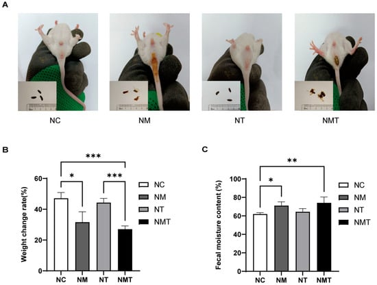 General condition of mice in each group. (A) Fecal morphology and perianal condition. (B) Body weight change rate. (C) Fecal moisture content. Data are presented as mean ± SD. * p < 0.05, ** p < 0.01, *** p < 0.001. NC: normal group, NM: model group, NT: TMAO group, NMT: TMAO + model group.