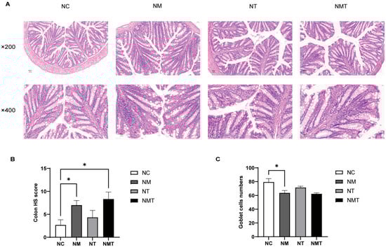 Colonic histology in mice of each group. (A) Representative images of colonic sections at different magnifications (×200, ×400). Scale bars: 50 µm, 20 µm. (B) HS scores of colonic tissue. (C) Goblet cell counts. Data are expressed as mean ± SD. * p < 0.05. NC: normal group, NM: model group, NT: TMAO group, NMT: TMAO + model group.