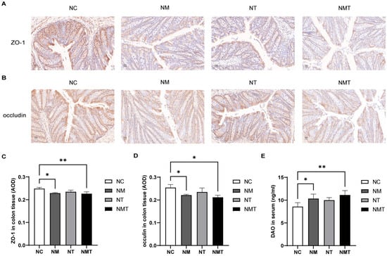 Intestinal mucosal barrier-associated molecules in different groups of mice. (A) ZO-1 protein expression in colonic tissue (IHC, ×400). Scale bar: 20 µm. (B) Occludin protein expression in colonic tissue (IHC, ×400). Scale bar: 20 µm. (C) Average optical density of ZO-1 protein in colonic tissue (n = 3). (D) Average optical density of occludin protein in colonic tissue (n = 3). (E) Serum DAO levels. Data are expressed as mean ± SD. * p < 0.05, ** p < 0.01. NC: normal group, NM: model group, NT: TMAO group, NMT: TMAO + model group.