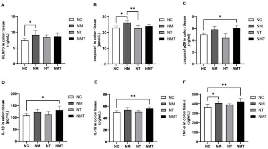 Changes in inflammasome-associated molecules and inflammatory cytokines in colonic tissues of mice. (A) NLRP3 levels in colonic tissues. (B) Caspase-1 levels in colonic tissues. (C) Caspase1-p20 levels in colonic tissues. (D) IL-1β levels in colonic tissues. (E) IL-18 levels in colonic tissues. (F) TNF-α levels in colonic tissues. Data are presented as mean ± SD. * p < 0.05; ** p < 0.01. NC: normal group, NM: model group, NT: TMAO group, NMT: TMAO + model group.