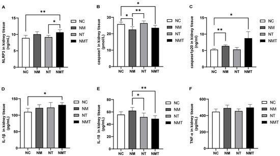 Changes of inflammasome-associated molecules and inflammatory cytokines in kidney tissues across groups. (A) NLRP3 levels in kidney tissue. (B) Caspase-1 levels in kidney tissue. (C) Caspase-1-p20 levels in kidney tissue. (D) IL-1β levels in kidney tissue. (E) IL-18 levels in kidney tissue. (F) TNF-α levels in kidney tissue. Data are presented as mean ± SD. * p < 0.05; ** p < 0.01. NC: normal group, NM: model group, NT: TMAO group, NMT: TMAO + model group.