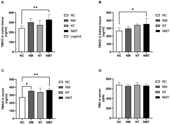 Changes in TMAO and TMA levels in mice across different groups. (A) TMAO content in colon tissue; (B) TMAO content in kidney tissue; (C) TMAO content in serum; (D) TMA content in serum. Data are expressed as mean ± SD. * p < 0.05; ** p < 0.01. NC: normal control group; NM: model group; NT: TMAO group; NMT: TMAO + model group.