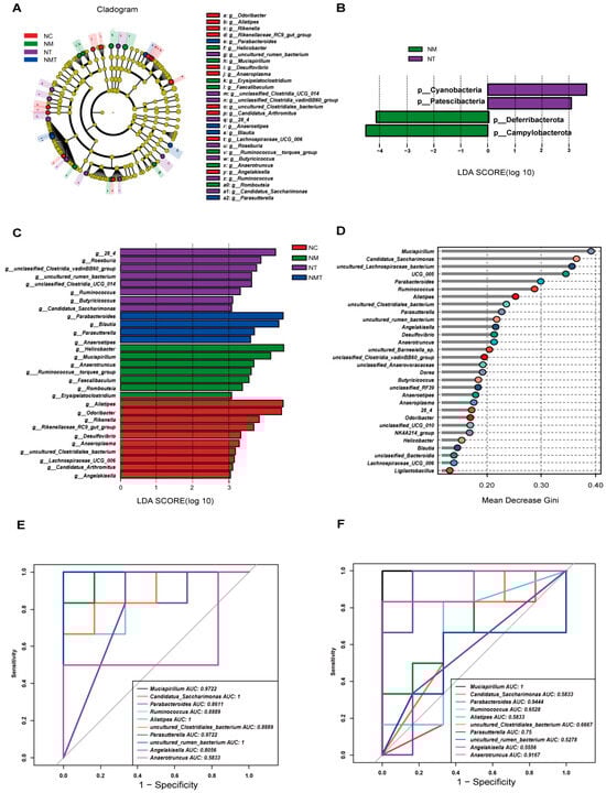 Analysis of intergroup differences in microbial species in cecal contents. (A) LDA bar chart at the phylum level. (B) Cladogram at the genus level. (C) LDA bar chart at the genus level. (D) Random forest plot at the genus level. (E) ROC curve (NC vs. NM). (F) ROC curve (NM vs. NMT) (n = 5). NC: normal control group, NM: model group, NT: TMAO group, NMT: TMAO + model group.