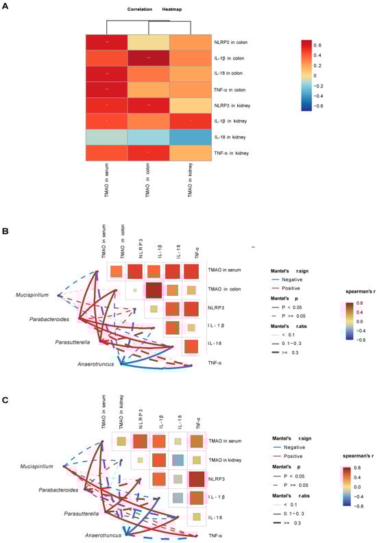 We further performed Spearman correlation analysis to investigate the associations between TMAO, inflammasomes, inflammatory factors, and key bacterial genera, aiming to explore the pathological mechanisms through which TMAO influences the gut–kidney axis in diarrhea. The Spearman analysis results revealed a heatmap of the correlations between TMAO and inflammasomes/inflammatory factors (Figure 9A). Serum TMAO showed a highly significant positive correlation with colonic NLRP3, IL-18, and TNF-α (p < 0.01) and a significant positive correlation with kidney NLRP3 and IL-1β (p < 0.05). Colonic TMAO was highly significantly positively correlated with colonic IL-1β and kidney NLRP3 (p < 0.01) and significantly positively correlated with kidney TNF-α (p < 0.05). Kidney TMAO showed a significant positive correlation with kidney IL-1β (p < 0.05). Serum, colonic, and kidney TMAO demonstrated varying degrees of positive correlations with inflammasomes and inflammatory factors, except for kidney IL-18. In addition, we selected key bacterial genera with high AUC values from the model and TMAO + model groups and analyzed their correlations with TMAO, environmental factors, and inflammatory markers (Figure 9B,C). The characteristic genera Mucispirillum and Anaerotruncus in the model group were negatively correlated with TMAO, although not statistically significant (p > 0.05). Anaerotruncus showed a significant negative correlation with colonic IL-18, colonic TNF-α, and kidney IL-1β (p < 0.05). In the TMAO + model group, the characteristic genera Parabacteroides and Parasutterella were significantly positively correlated with serum and colonic TMAO (p < 0.05). Parabacteroides showed a significant positive correlation with colonic IL-18 and IL-1β (p < 0.05), while Parasutterella was significantly positively correlated with colonic IL-18, kidney NLRP3, and kidney TNF-α (p < 0.05).