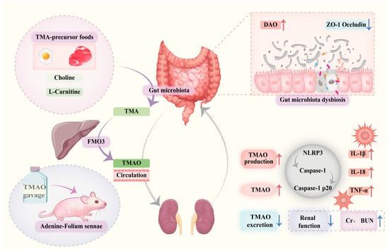 Among gut microbiota-derived metabolites, trimethylamine N-oxide (TMAO) has gained considerable attention due to its involvement in various disease processes. Extensive research has shown that TMAO is a detrimental metabolite produced by the metabolism of gut bacteria [,]. Dietary components like choline and L-carnitine are metabolized by intestinal microbial trimethylamine lyases into trimethylamine (TMA), and then oxidized by hepatic flavin-containing monooxygenase 3 (FMO3) to form TMAO, primarily excreted via the kidneys [,]. TMAO has detrimental effects on both intestinal and renal tissues. TMAO has been shown to decrease the expression of tight junction proteins, including occludin and zonula occludens-1 (ZO-1), while significantly raising markers of intestinal barrier disruption, such as diamine oxidase (DAO), leading to increased intestinal permeability []. Upon entering the bloodstream, TMAO induces systemic inflammatory responses, compromises the intestinal mucosal barrier, and exacerbates gut microbial dysbiosis, hence worsening diarrhea. Increased concentrations of TMAO in the bloodstream correlate with elevated levels of creatinine (Cr) and blood urea nitrogen (BUN), which exacerbate renal impairment and elevate mortality risk in patients []. TMAO accelerates the development of nucleotide-binding oligomerization domain-like receptor protein 3 (NLRP3) inflammasomes in renal tissues and activates cleaved interleukin-1 beta (IL-1β) and caspase-1 []. The NLRP3 inflammasome transforms pro-caspase-1 into Caspase1-p20, which then activates IL-1β and interleukin-18 (IL-18). In vitro studies have shown that TMAO can induce ferroptosis and apoptosis in renal tubular epithelial cells, contributing to renal injury [,]. Limited evidence also suggests that TMA may disrupt mitochondrial homeostasis and promote inflammation in intestinal epithelial cells []. Our previous research demonstrated that a mouse model of diarrhea exhibits concurrent intestinal and renal impairment, accompanied by gut microbiota dysbiosis and elevated TMAO levels [,]. Further investigation into the role of TMAO in gut–kidney axis regulation may provide key insights into the pathogenesis of related disorders.