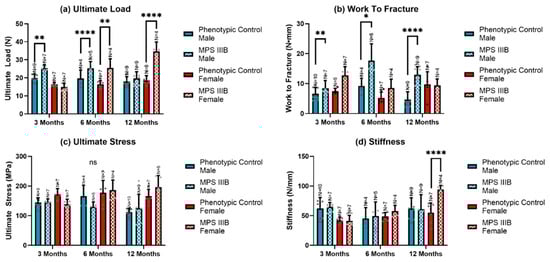 - Ashby, F.J.; Castillo, E.J.; Ludwig, Y.; Andraka, N.K.; Chen, C.; Jamieson, J.C.; Kabbej, N.; Sommerville, J.D.; Aguirre, J.I.; Heldermon, C.D. Femoral Structure and Biomechanical Characteristics in Sanfilippo Syndrome Type-B Mice. Int. J. Mol. Sci. 2023, 24, 13988. [Google Scholar] [CrossRef] [PubMed]