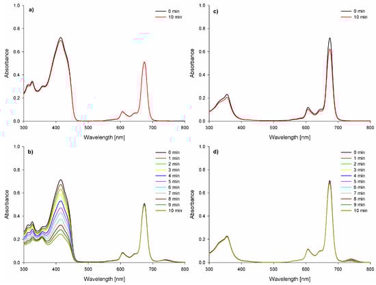 DPBF decomposition in the mixture with SiPc in DMF activated by: (a) light (0.5 mW/cm2; 660 nm; cSiPc = 2.58 × 10−6 M, cDPBF = 3.42 × 10−5 M); (b) ultrasounds (3 W, 1 MHz, 40% duty cycle); (cSiPc = 2.57 × 10−6 M, cDPBF = 3.46 × 10−5 M); SiPc decomposition in DMF exposed to: (c) light (>450 nm); (d) ultrasounds (3 W, 1 MHz, 40% duty cycle).