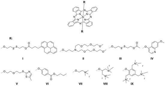 A similar phenomenon has been reported by van de Winckel et al. [] for compounds I–III (Figure 4). Values of ΦΔ dependent on substituent were in the range from ca. 0.03 for II to ca. 0.38 for III [,]. Surprisingly, the nitrogen atom which is included in the aromatic ring does not cause a dramatic drop in singlet oxygen formation. It was reported high ΦΔ values for phthalocyanines IV (0.62) and V (0.86) [,]. Additionally, axial substituents bearing aliphatic chains in their structure without nitrogen atoms present high ΦΔ values, i.e., VI (0.48) []. On the other hand, the presence of quaternized nitrogen atoms, results in quenching 1O2 formation as well, i.e., VII (0.11), VIII (0.11), and IX (0.08) (Figure 4) [].