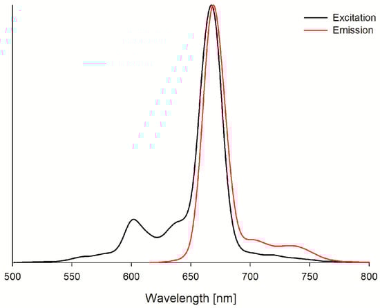 The photostability of SiPc was evaluated as well in a liquid environment (DMF and DMSO). SiPc under light exposure decomposed according to the photobleaching mechanism. It was observed that the absorption bands were vanishing, without forming new ones (Figure 3c). The quantum yield values (18.9 × 10−6 and 34.1 × 10−6 in DMF and DMSO, respectively) of photodegradation of the presented photosensitizer classify it as a stable compound []. The ability of SiPc to emit light (Figure 5) has also been evaluated. Its fluorescence quantum yields were determined at the level of 0.07 (Table 1, Figure 5), which are much lower in comparison to the values of the Φf for the standard.
