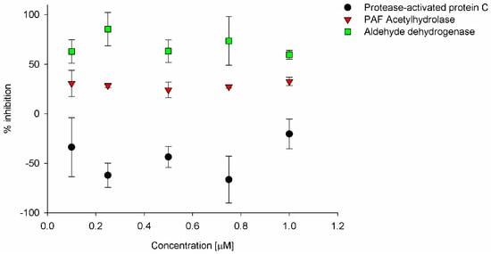 The impact of SiPc on the activity of enzymes was also evaluated. Highly inhibited was aldehyde dehydrogenase at about 85% in the sensitizer concentration of 0.75 µM (Figure 6). Such a rate of inhibition may indicate additional independent of the studied compound’s light mechanism of anticancer activity. Otherwise, tested phthalocyanine reduced the activity of PAF acetylhydrolase at ca. 40% independently of the concentration within the studied range. Interestingly, our sensitizer increased the activity of protease-activated protein C, which is responsible for anticoagulant and anti-inflammatory activity []. Additional stimulation of protease-activated protein C may limit inflammation associated with the PDT procedure. Nevertheless, promising results of the impact of SiPc on enzymatic activity have to be further evaluated.