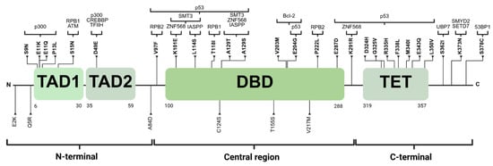The distribution of 33 variants. Those in bold are located at recognition sites for proteins interacting with p53, which are shown at the top of the figure. TAD1: transactivation domain 1. TAD2: transactivation domain 2. DBD: DNA-binding domain. TET: tetramerization domain. Created with BioRender.com.