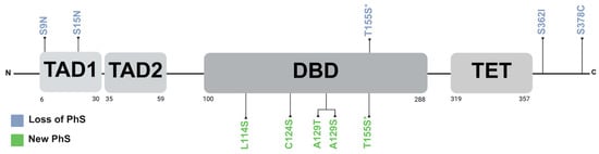 Protein phosphorylation plays a critical role in various cellular processes by altering its three-dimensional structure and/or modifying the protein–protein interactions. The p53 protein is crucial for numerous cellular processes, and its levels, activity, and localization are tightly regulated by PTM including ubiquitination, acetylation, SUMOylation, and phosphorylation []. In this study, in silico analysis revealed that the missense VUSs p.S9N, p.S15N, p.T155S, p.S362I, and p.S378C lead to the loss of residues susceptible to phosphorylation, while p.L114S, p.C124S, p.A129T, p.A129S, and p.T155S generated new potential PhS.