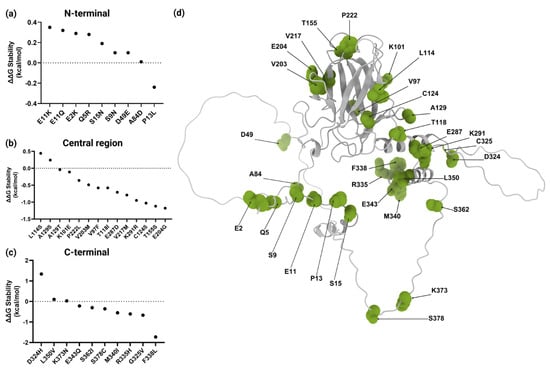 Structural stability analysis and three-dimensional structure of wild-type p53 protein. ΔΔG values for variants in (a) N-terminal, (b) central, and (c) C-terminal regions. (d) A three-dimensional representation of the p53 structure with residues affected by variants highlighted in green. Modeled with ChimeraX 1.10. Created with BioRender.com.
