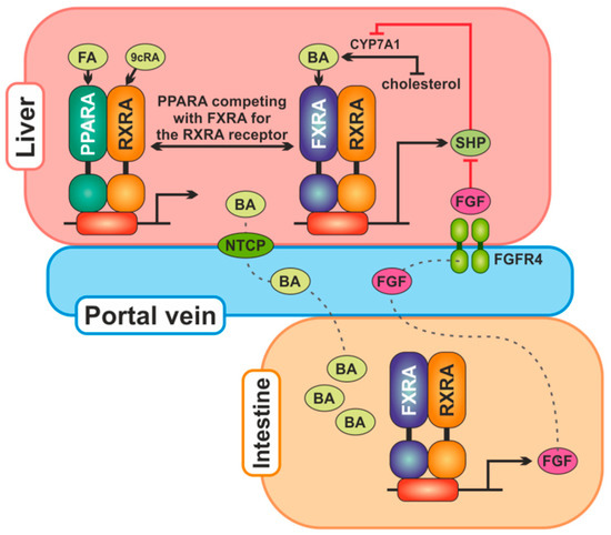 The main relationships between proteins encoded by genes analyzed in the work. Bile acids (BA) are produced in the liver from cholesterol by CYP7A1 and secreted into the gallbladder. From the ileum, they are reabsorbed in enterocytes, where they activate FXR, which stimulates transcription of the FGF19 gene. The FGF19 protein is secreted into the portal circulation and in the liver binds itself to the receptor FGFR4 to reduce CYP7A1 expression. Bile acids synthesis in the liver is also regulated by FXR, which transcriptionally increases SHP protein expression, which reduces CYP7A1 expression. PPARA competes with FXR for the RXRA receptor and may downregulate SHP expression. Abbreviations: BA, bile acids; FA, fatty acids; CYP7A1, cholesterol 7alpha-monooxygenase; FGF, fibroblast growth factor; FGFR4, fibroblast growth factor receptor 4; FXRA, farnesoid X receptor alpha; NTCP, Na+-taurocholate cotransporting polypeptide; PPARA, peroxisome proliferator-activated receptor alpha; RXRA, retinoid X receptor alpha; SHP, small heterodimer partner; 9cRA, 9-cis retinoic acid.
