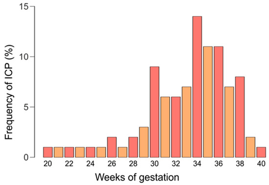 In 72% of women, ICP symptoms appeared between 28 and 36 weeks of pregnancy, in 9%, in the second trimester of pregnancy (<28 weeks), and in 19%, after 37 weeks. The gestational time of onset of intrahepatic cholestasis symptoms in the study group is presented in Figure 2.